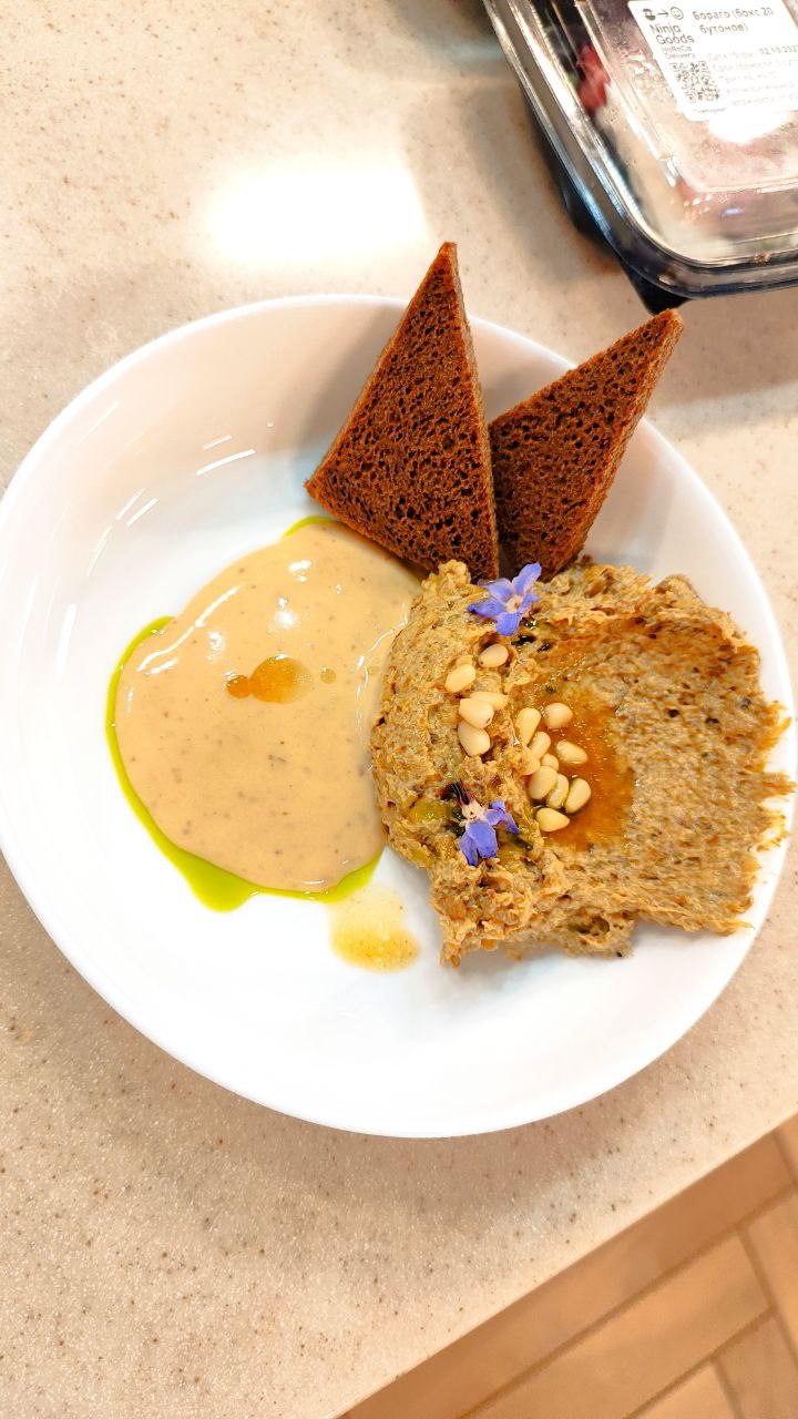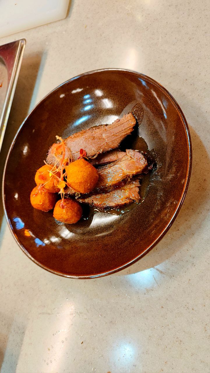 - Печисто из лопатки кабана, томленое в темном квасе, с хреном с цыбриками вместе с соусами Гурмикс.