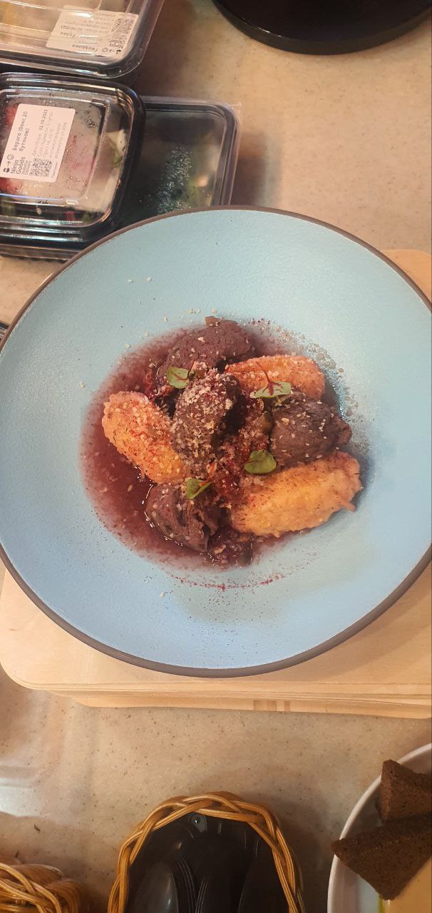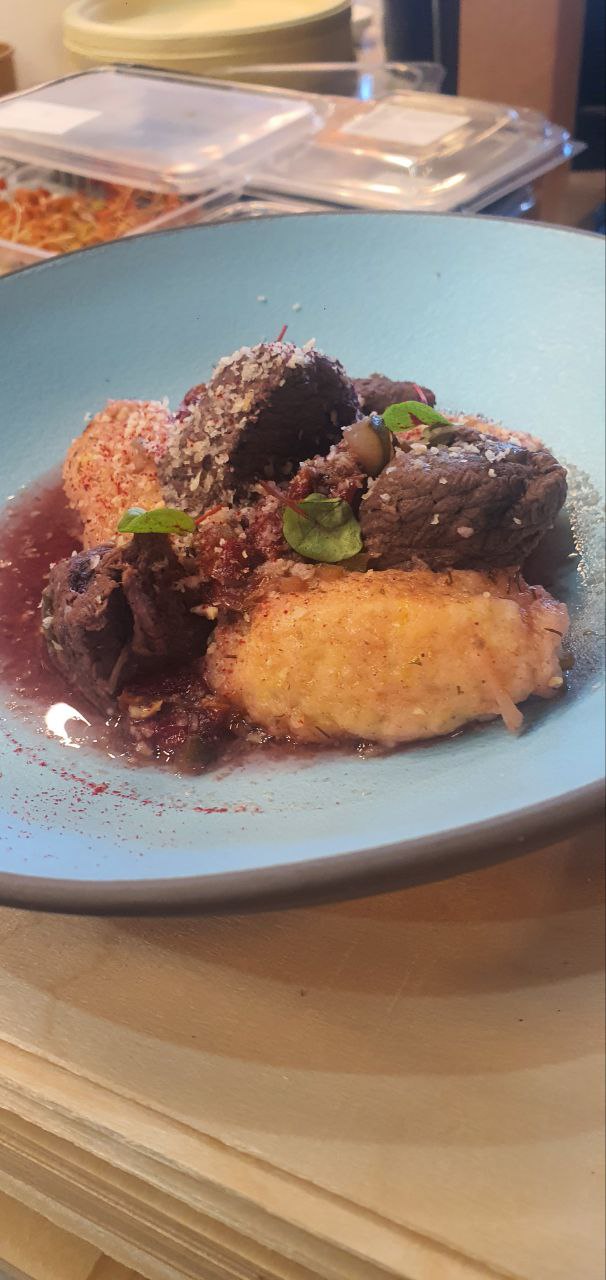 - Гуляш «По-Радивиловски» (с вишней, вином , вишнёвым соком и маринованным огурцом) из лося ( косули или оленя) с мучными клёцками;