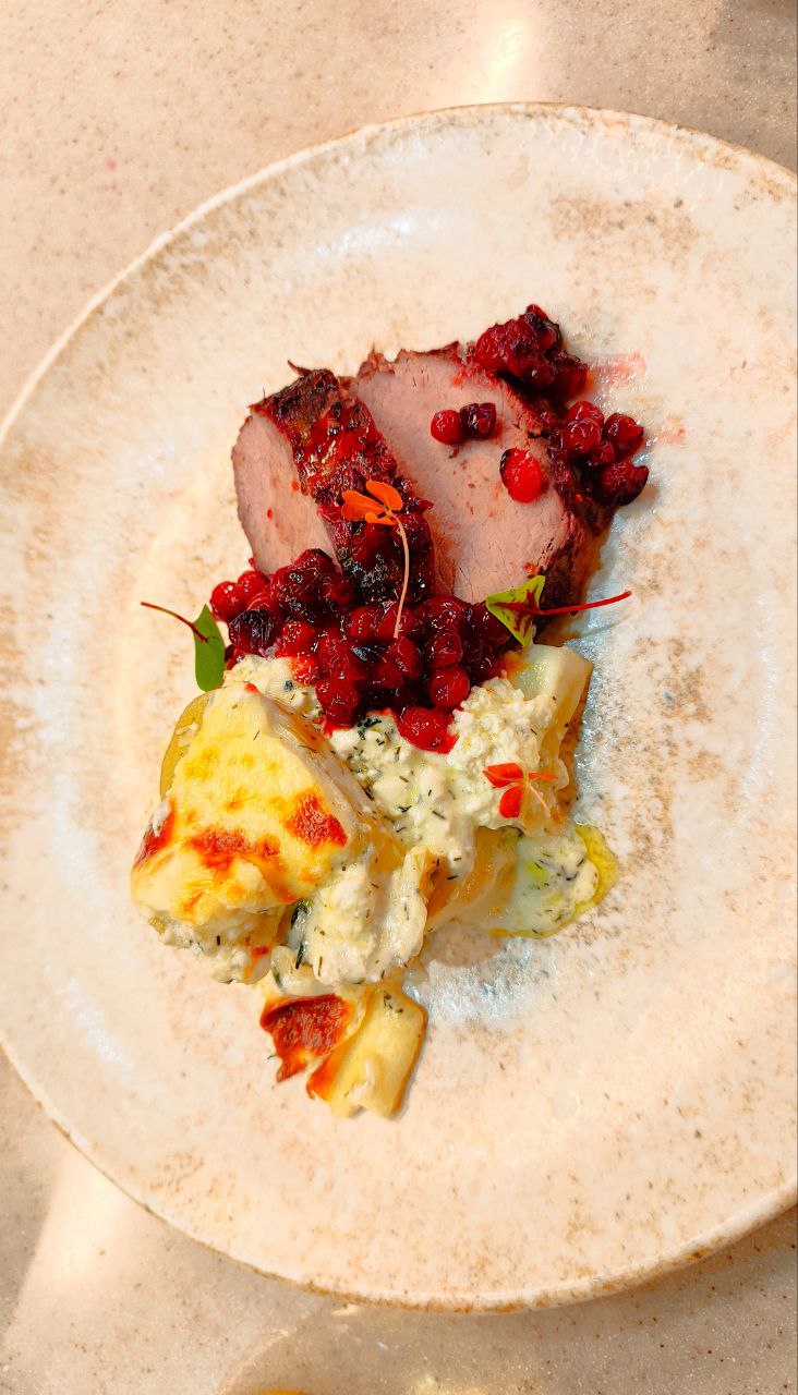 - Смаженое мясо бобра , под клюквенным соусом с картофельными драниками.;