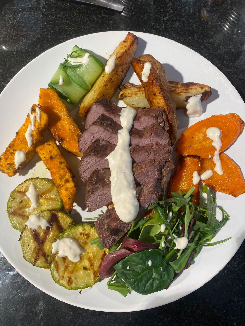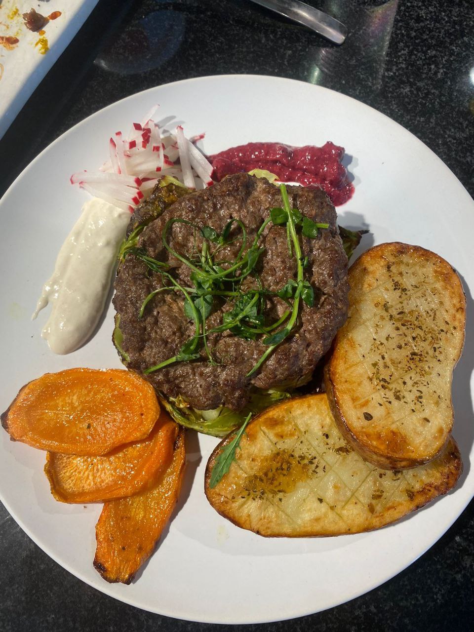 - Окорок лося с морковным гороховым пюре и ягодным соусом .