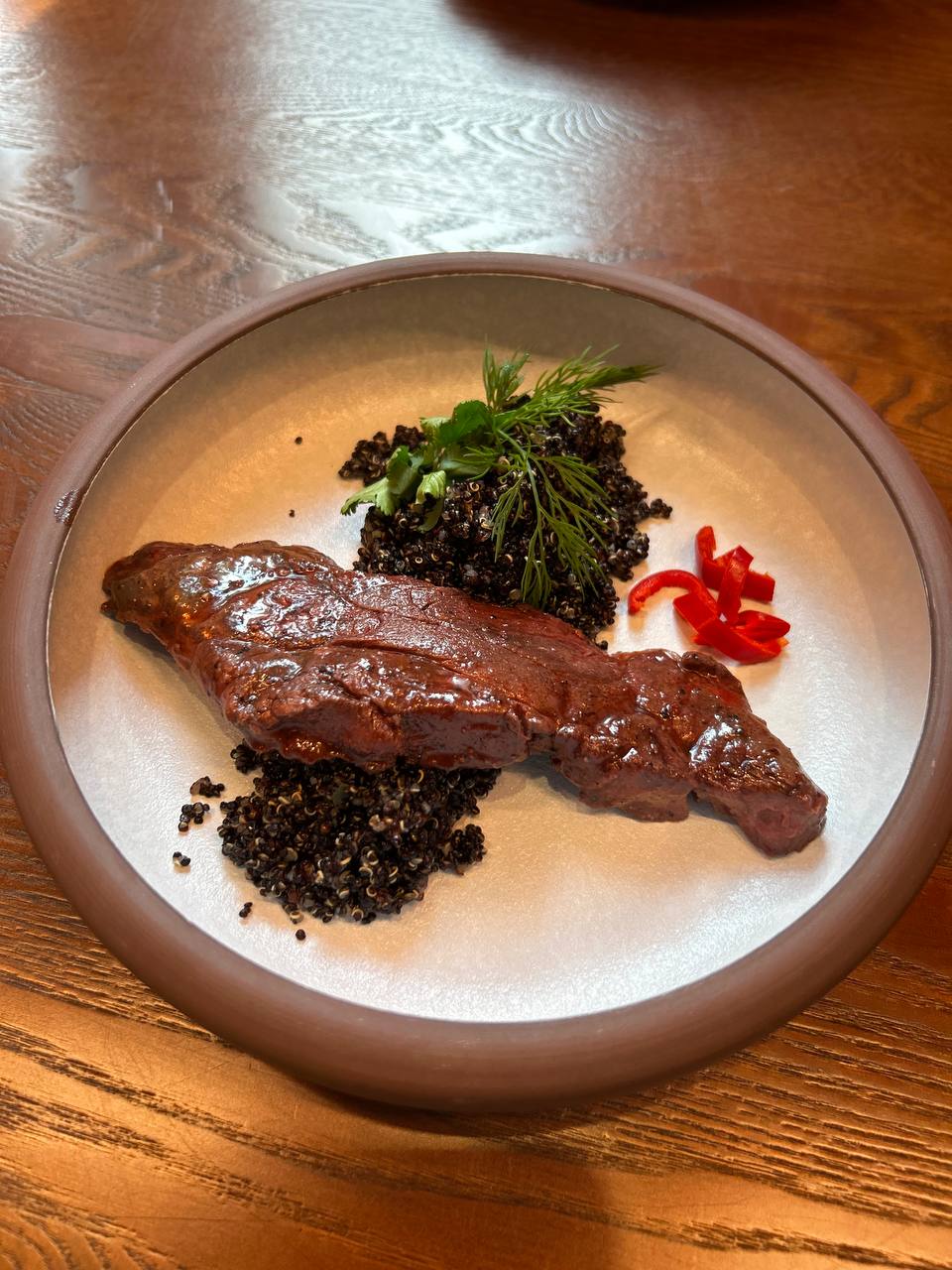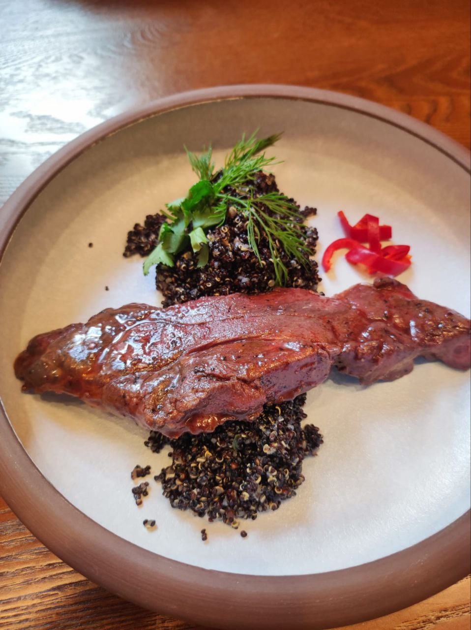 - Внутреннюю часть бедра(окорок) медведя без кости с черным киноа и грибами шиитаки;